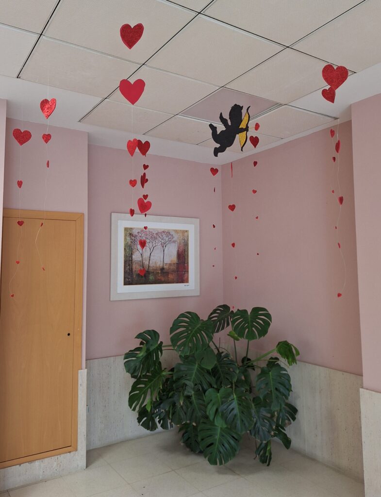 Ayer, 14 de febrero, celebramos el Día de los Enamorados. Decoramos la Residencia , nos divertimos muchísimo con el karaoke y todos los usuarios recibieron un paquetito con un llavero, un broche en forma de corazón, piruletas y bombones.